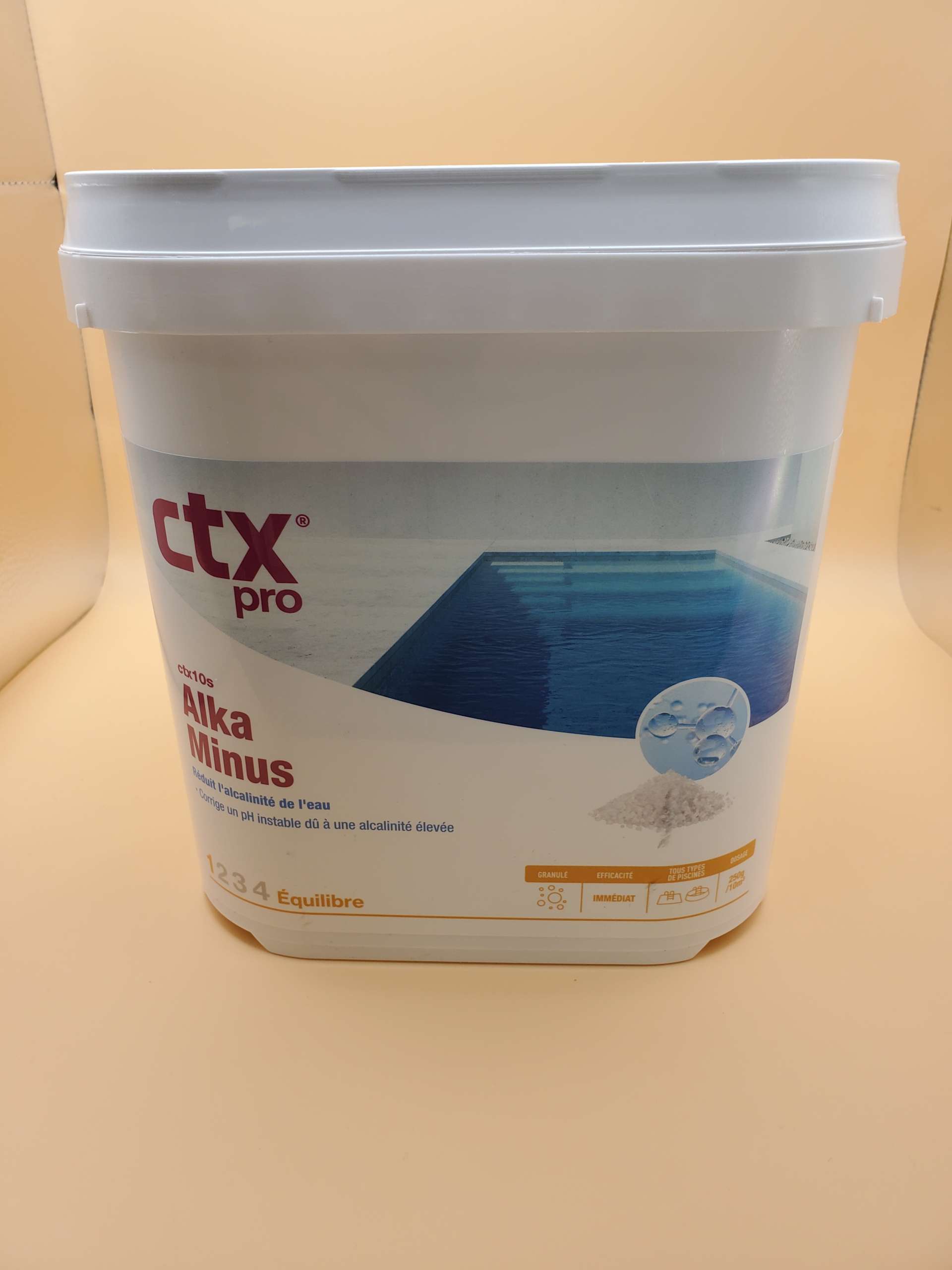 Le CTX Alkanal Minus est un correcteur d’alcalinité spécialement conçu pour réduire le TAC (Titre Alcalimétrique Complet) de l’eau de votre piscine.